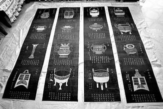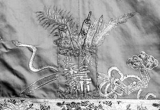 另一件原是四联屏风的屏面,也是黑色衬底,以金线绣出16件商周时期青铜器,旁边绣出青铜器上的金文铭文,并加上了隶书的说明。16件青铜器件件都是精彩之作,不乏鼎、钟等重器。有专家推测,从这些青铜器的价值判断,多半是宫中珍藏之物。