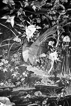 曾应菁还有两件藏品也令人称奇:一件是黑色衬底的花鸟绣,中间部位一只五彩斑斓的锦鸡侧首凝望,周围数十只麻雀、鹌鹑、鸢等或盘旋,或啼鸣,或散步,水草、箭竹、牡丹、怪石点缀其间。仔细端详可以发现,其使用的绣线相当细,因此可以很好地表现出花鸟的细部特征,使得整幅画面格外灵动传神。