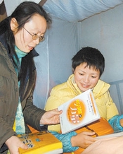 | 文花枝(右一)最爱读书,新年里本报记者带了她最喜欢的书,她高兴地收下了。本报记者 郭立亮 摄 |