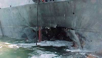 资料图片:被“自杀艇”炸出大洞的美军“科尔”号导弹驱逐舰