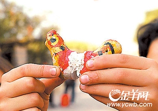 岁月流逝,泥鸡已渐被遗忘,但在镇濠村还有一对痴心的“泥鸡夫妻”几十年来坚持制作泥鸡。几十年来,每逢年晚,冯福夫妻都用手工捏制泥鸡。据福伯介绍,泥鸡在当地又称“咯咯仔”,是一种儿童玩具。制作泥鸡,要在春天挖泥,用木槌捣后放进锡模压成鸡头、鸡尾两部分,然后晒干。鸡头部分有一横膜,中有小孔,留来插竹哨。制竹哨时,把小篱竹裁成几分长一截,在一头斜削一刀,插进一小块叶片,吹响即成。到入冬时,把竹哨插进鸡头横膜,再用牛皮纸把鸡头和鸡尾连接起来,着色涂油,便成成品。泥鸡头部下前方有一小孔,尾部左侧也有一小孔,用嘴对尾部小孔一吹,泥鸡便引颈啼唱,声音与真鸡无异;用右手拇指按住尾部小孔频频抖动,还会发出如母鸡生蛋下窝时的咯咯声。工艺之巧,令人赞叹。已是86岁的冯福如今心情有点复杂:夫妻携手制作泥鸡数十年,虽有了终生难忘的感情,但如今这玩具已日渐式微,所以做完这批泥鸡以后就不打算再做了。饶新一关炳辉摄影报道