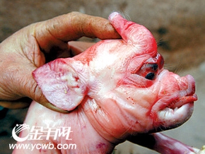 重庆今天消息据今天《重庆晨报》报道:民间传说,“象猪”能带来好运。前晚,大足县邮亭农民彭路圆家的母猪就产下这么个怪东西:全身光滑无毛,鼻子如同象鼻长在头顶,耳朵也比普通猪仔大。“刚生下就有两斤六两重,是其他猪仔的两倍!”彭路圆说。只可惜,当晚12时,“象猪”突然口里不断吐血,几分钟后就闭上了眼睛。