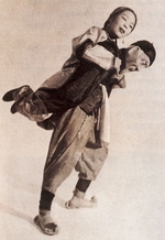 图③戴爱莲20世纪40年代根据桂剧《哑子背疯》改编的舞蹈《老背少》。