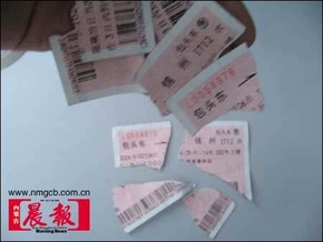 韩女士撕毁的两张卧铺票 内蒙古晨报记者 冯程摄影