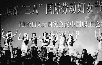 昨日,云南代表团与广东代表团在驻地举行庆祝“三八”国际劳动妇女节联欢晚会。图为云南佤族原生态表演艺术团为代表们献上精彩节目。 杨峥/摄