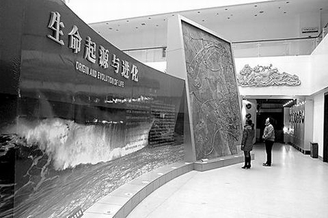 生命起源与进化展厅从生命起源开始,以地质历史中的生物进化为主线安排陈列,展现地球生命38亿年的进化历程,并且突出生物进化过程中的重大事件和观众感兴趣的内容。其中脊椎动物特别是恐龙的进化尤其引人注目,展厅陈列的9具恐龙骨架、恐龙足迹化石、6条电动的机器恐龙把观众带入到了奇妙的恐龙世界……
