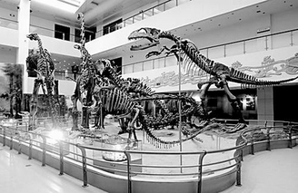 生命起源与进化展厅从生命起源开始,以地质历史中的生物进化为主线安排陈列,展现地球生命38亿年的进化历程,并且突出生物进化过程中的重大事件和观众感兴趣的内容。其中脊椎动物特别是恐龙的进化尤其引人注目,展厅陈列的9具恐龙骨架、恐龙足迹化石、6条电动的机器恐龙把观众带入到了奇妙的恐龙世界……