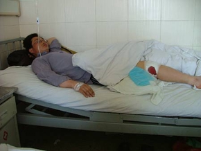 在爱民医院,记者采访了被手榴弹炸伤的受害人于雨,于雨介绍,他送女儿的同学回家,走到30号楼附近时,听说有人打架,他还没走跟前,就听轰的一声,他就被炸倒了,经医生诊断,他的左腿被弹片击中,猓窝部腓总神经损伤。现以通过手术将弹片取出。