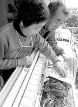 昨天上午,记者一大早就赶到居住在仙霞路1225弄某号6楼的许先生家,记者在主人热情引领下走到南阳台,只见2只幼小的褐色鸟仰着头静静地朝外观望着,鸟巢似乎显得很简陋,它建筑在不锈钢花架上的一块废弃拖把布上,上面是干树枝垒成长约25厘米的腰型巢穴。记者在拍摄时惊动了小鸟,它们立即用小嘴进行自卫,拼命地想啄照相机的镜头。许先生说,两只大斑鸠都出去觅食了,过一会就回来给它们喂食。