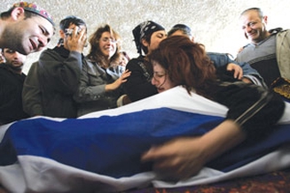 4月18日,一名特拉维夫自杀袭击遇难者的亲属们在葬礼上哭泣。