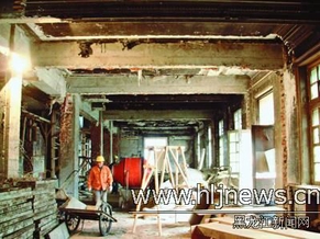 记者去现场调查后,发现从一楼到三楼的隔断都被打通,整个内部结构均被破坏,破缺的墙体到处是伤痕累累的创口,室内原本保存完好的独具特色的装饰更是荡然无存。惟有一层入口处天花板还残留着一些往日遗痕。记者端起相机没拍几下就被一个工头模样的人制止,他让记者找公司的头儿去。问他是什么公司,他却说不知,并让记者立即离开现场。记者在了解到这里被本市一家著名婚纱影楼买了使用权以后,便向哈尔滨市规划局名城保护处举报,他们立即派规划执法监察大队去现场制止,并下了停工单。处长赵阳非常气愤地介绍,这座老楼的施工单位在报批时,规划局批的是照原样修缮,并且还没有下发施工许可证。这种破坏保护建筑的违法行为是绝对不允许的。