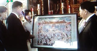 随后,马崎连氏宗亲赠送给连战六份礼物,分别是家乡马崎的米、水、农民漆画作品《盛世祥和》、象征团结友爱的桂圆干、当地农民书法作品以及新修订的连氏族谱。
