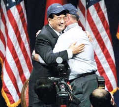 头戴棒球帽 一个美式拥抱(图)