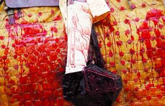 2004年4月28日,西班牙塞维利亚,斗牛士的护腿、马镫和马穿的盔甲上面沾满了血迹。