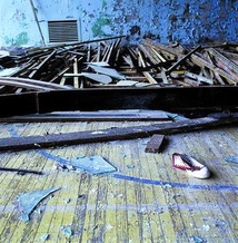 在一个房间里,桌子上放着几个杯子,二十年前这里曾经洋溢着节前的气息(五一劳动节的庆典)。现在这里只有破败的暖气片,打开着的门,还有剥落了漆的窗子。