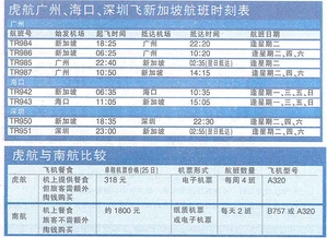 虎航在中国大陆开辟的三条廉价航线:广州———新加坡深圳———新加坡海口———新加坡