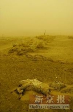 继续向北,便进入沙地腹地。沙尘威力开始增强,七八级风夹杂着沙土小碎石满天飞舞。这里已看不到牧民和牲畜,道路两旁偶尔有死羊的腐烂尸体,几间民房在沙尘中看起来若有若无。公路被沙尘完全掩埋,在沙地低洼的地方,能见度只有5米。