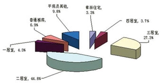随着几代人同居陋室的尴尬情景成为历史,人们对住房建筑式样的要求越来越成为关注的重点。调查显示,截止2005年底,全省城镇居民中,住二居室的比例最高,为44.8%,加上有三居室、四居室、单栋住宅这三种式样的住户,共有79.1%的住户房子不小于二居室,同比增加了4.3个百分点;住在普通楼房和平房的户占到16.7%,同比减少了3.9个百分点。从全省城镇居民家庭拥有的住宅式样构成来看,以二居室为最多,二居室和三居室为主流户型。