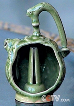 可是早在一千多年以前,古人又是用什么方法制作出倒流壶的呢?经过专家们的研究和现场示范,原来倒流壶在制作过程中也是要“倒”着作。需要先用陶泥拉出壶形;再将准备好的导管放进壶胎内部,然后再将成型壶口封上,进炉烧制。