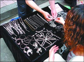 路边摊上银光闪闪的硬币首饰引来不少路边竞相挑选