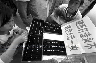 昨日下午,记者在昆明东风西路云南师范大学实验中学附近看到,有4个流动摊点在卖这类戒指,价格便宜,做工精细,款式多样,引来不少路人挑选。记者看到1名摊贩摆出了一个装满各式各样银白色戒指的大盒子,摊位前围满了不少挑选戒指的路人,购买的大多是学生,这些戒指的色泽和质地与白金或银戒很相似,摊贩们说,这些戒指是他们用硬币加工出来的,先把硬币熔化,将熔化的金属液体倒入模子里,打制成各式各样的戒指,平均每天可以卖四五十元,好的时候卖到100多元。“这真是硬币做的吗?会不会褪色啊?”前来询问和挑选的顾客络绎不绝,摊贩们的生意很红火,30分钟内就以超过4元的价格卖出了8枚戒指。