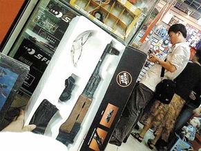 在这家电子市场的二楼,在场内西北角的“新奇特”玩具店的门口,摆放着3把仿真步枪的包装纸盒。记者顺手拎起一把仿苏联“AK47”突击步枪的盒子,盒子的重量超过了记者想象。店内一女子告诉记者,“这把枪可不是塑料的,枪管、枪膛和发射机构都是金属的,电动发射,绝对高度仿真,比塑料仿真枪的劲也大多了!”