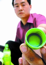 今年4月12日,家住新密市的郑振松在市区一烟酒摊买了箱绿茶,在喝的过程中发现一瓶绿茶的瓶盖上没任何字样,瓶盖上的产品批号为2006032906:51.zzl。4月19日,郑振松在另一箱绿茶中又发现一瓶产品批号为2006032906:50.zzl的绿茶瓶盖内也没任何字样,这次郑振松认真起来。他拨打了厂家的客服热线反映情况,热线人员说他买的可能是假冒产品,如果是统一的产品应该有“谢谢惠顾”的字样。