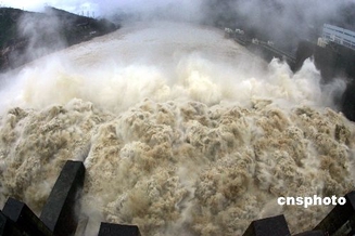 6月7日上午,福建省气象台将暴雨预警信号升级为黑色。闽江水口水库7日15时入库洪峰量达3.07万立方米/秒,总出库量2.87立方米/秒,为20年来最大洪水。图为水口水电站大坝全力泄洪的情景。 中新社发 杨阿娜 摄