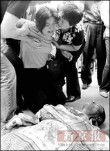 昨日,猝死的哥的妻子在丈夫遗体前两度昏厥。 本报记者 张涛 摄