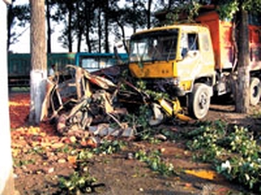 记者看到,这辆肇事的大货车头朝东南停在两棵大杨树的中间,货车头部紧紧顶着被撞的出租车,出租车已经被完全撞瘪,该出租车标有“祥龙”字样,被撞散了架的四轮拖拉机和它紧靠在一起。拖拉机司机的尸体弯曲着倒在拖拉机的前面,蓝色上衣遮挡着死者的上身及头部。其驾驶室和车斗已经分离,开裂的后车斗被撞飞在驾驶室西侧两三米处。一辆有晨报标志的黄色自行车躺在马路上,车把扭曲向后,前车轮上压着一堆红砖。