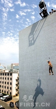 距离地面约15米的时候,已经可以清楚地看到地面上的工作人员。虽然记者佯装无所谓的样子开始跟大家打招呼,但清楚地感到胳膊、腿及整个身体都是僵硬的。心里在想:如果现在绳子断了人掉下去,估计后果还是比较严重。