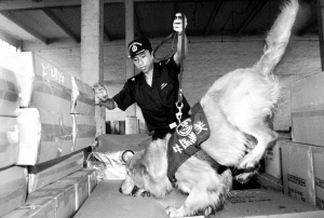 金毛寻回犬“星龙”和“星妹”是黄埔海关新增添的缉毒“秘密武器”。记者昨日在黄埔海关关内,见识了这两只刚刚从盐田训练基地毕业的缉毒明星的神勇。在训练员的牵引下,只见“星龙”和“星妹”从它们的座架上一跃而下,在一堆堆货物里上窜下跳,不时地用鼻子左嗅嗅右闻闻。在确定没有毒品时,才摇头摆尾地回到训练员身边。