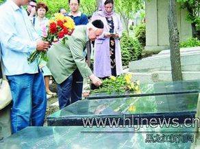 而后,众人一起顺着甬道,来到以色列总理奥尔默特祖父的墓前,奥尔默特的兄长欧慕然怀着沉重的心情祈祷后,为祖父献上鲜花,并在墓前放上犹太人祭奠先人所用的小石块。欧慕然说:“我的家族曾经讨论过,是不是应该把我们祖父母的遗骨迁移到以色列来。2004年,我和奥尔默特来这里为祖父母扫墓,看到保存完好、修缮一新的祖父母墓碑,从心底里十分感动。于是我们一致的意见是应该理解他们正确选择了哈尔滨,尊重他们热爱中国和哈尔滨的感情,尊重他们与哈尔滨这座城市结下的不解之缘。我们家族的根在中国,在哈尔滨。”