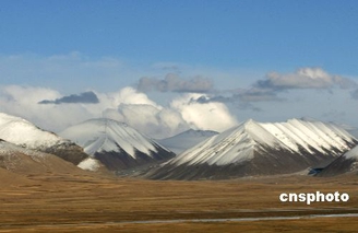 七月一日,世界上海拔最高、线路最长的高原铁路青藏铁路将正式全线通车,一条钢铁游龙将史无前例地穿越可可西里、三江源、羌塘草原,进入那个复盖着冰雪、开着雪莲花的雪域高原深处,到达圣地拉萨。图为青藏铁路沿线的巍巍昆仑(摄于二零零五年五月二十一日)。中新社发 武仲林 摄