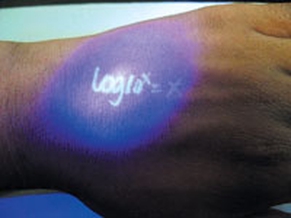 隐形笔通体紫色,看起来与普通的水笔没有什么区别,只是在笔帽里装有“机关”——顶端有一个小灯泡,由三颗微型电池供电。按下开关,灯泡会发出与验钞机一样的光。记者在白纸上写下了一个数学公式,刚写下时还有淡淡的水印,但10秒钟后,就看不到任何印记了。按照说明书所说,记者用笔帽上的小灯泡照射白纸,纸面上清晰地显示了刚才写下的公式。而在手上和衣服上进行试验,隐形笔也都能发挥效用。