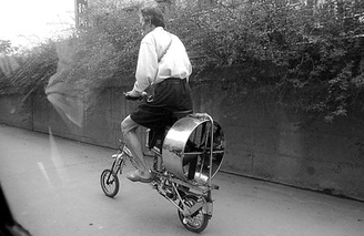 看起来像自行车,后面却拖着个大“风扇”,到底是啥子玩意儿?昨日上午10时,火车北站东二路19号小区里,居民们仰望着这个悬在4楼的“怪物”议论纷纷。据称这是付大爷的新发明------“地下飞机”,将于中午12时准时落地启动。