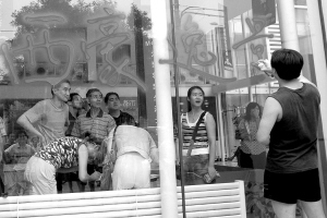 业主往售楼处玻璃喷写标语。(图片来源:京华时报 徐胤/摄)