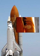2003年“哥伦比亚”号失事,去年“发现”号发射险遭不测,外部燃料箱泡沫材料脱落都是罪魁祸首。美宇航局几番改进,重新设计后的燃料箱拆除了“凸起气动负荷”斜面,另外对泡沫材料制成的冰霜斜面及连接燃料箱和轨道器的双脚架都进行了不同程度的改动。