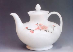 知道这两件瓷器的身份后,记者请求上手一试。展览负责人刘庆华几经考虑,在桌面铺上厚厚的毡子,并要求记者手不离毡,这才将两件瓷器捧到记者手中。轻!东西到手后的第一感觉便是如此。记者举到眼前细观:但见两件瓷器造型工整古朴,通体莹润洁白,呈现半透明的质感;腹部寥寥数笔,一支粉黛梅花俏立枝头,饱满传神。揭开壶盖,内部亦是釉色莹润细腻,毫无疵点。轻叩之,余音清亮,袅袅有声。