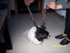 小狗是石先生几年前从附近狗市以150元钱买回的,狗贩子说这种狗的品种是“日本仲”,因此石先生给它起了个名字叫“仲仲”。“半岁时耳朵后面长出了两个小疙瘩。第二年,狗就停止生长了,可是‘辫子’却长得特别快,到第三年都已经垂到地面了。”石先生说。