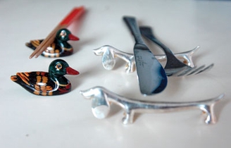 一对鸳鸯筷子支架和一对小狗餐刀支架。从这两副小物件可以看出女主人对生活细节的关注。