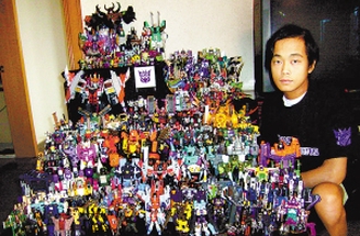 由于经济能力有限,我开始有选择地收集。我和好友开始进行了变形金刚的“军备竞赛”,他专门收集博派,我专门收集狂派,不仅这样,我还把我手头上的其他玩具跟同学交换他们的变形金刚玩具。几次考试完了,妈妈也会给我买变形金刚,有一次她还主动地买了两盒磁带给我,把我乐翻天了。我的“狂派军队”扩充得很快,有40多个了,基本把市面上有的变形金刚买了95%了。