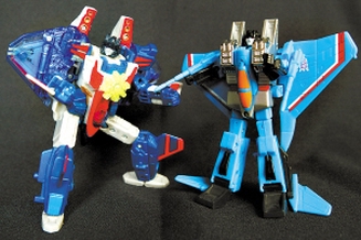 那年暑假,我和外婆来到中山的亲戚家玩,亲戚家当时可以收看香港电视节目,尽管是很不清晰的黑白电视,不过对于我来说,无疑是大开眼界!一天,电视里忽然出现了一套新的动画片《变形金刚》,我马上就被里面的机器人吸引住了,多么神奇啊!居然可以变形!因为是黑白电视,只能看到屏幕上的机器人都是不同程度的灰,我很难分辨谁是谁,只是依稀听得出一边是“狂派”,一边是“博派”,“狂派”是坏蛋,“博派”是好人。我记住了不少变形金刚的名字,其中最难忘的是那个很奇怪的名字“星星叫”,因为和他外形一样的有几个,我无法分辨出来,只是凭借他那尖锐的声音牢牢地记住了他。“星星叫”是个经常想背叛老大的二把手,我很喜欢他的率直,也喜欢他的自私,我觉得我很像他。如今,我在变形金刚迷友的圈子里的名字就叫“星星叫”,甚至在生活上,不少朋友也会把我称呼为“星星”或“叫叫”。