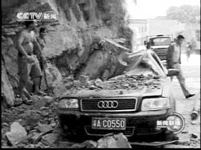 一汽车被巨石砸坏。