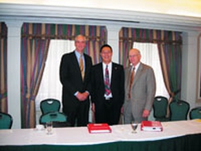 叶茂与康大校长罗林斯(左)和董事长梅尼格(右)合影