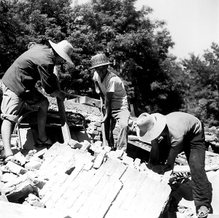 关仁山:集中埋在几个地方。记得当时丰南县与唐山交界处有一个砖窑,那是个三角地带,砖窑取土留下了一个大坑,那里埋了8万人。小孩子好奇,我们经常去那里看,尸体一车一车地拉到那里,唐山的向那里拉,丰南的也向那里拉。坑里撒下些石灰后就垒上尸体,铺上土,再用推土机压实;然后再放尸体,再压实。后来我听说,有一位伤员被当作尸体抬到那儿,遇到下雨,在埋葬前一刻醒过来了。1976年七八月的唐山,生死的距离是如此的微小。