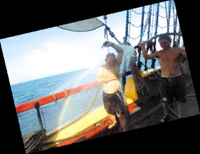气还没喘过来,传来大副的指令,前桅要收起一张帆。收帆必须爬到高高的桅杆上,黑暗中爬桅杆是一件危险的事,风很大,船摇晃得厉害,沿着摇摇晃晃的绳梯爬上桅杆,我们6个人借着绳子跟风搏斗了一个多小时才完成工作。回到风雨甲板上,筋疲力尽的我们总算迎来收工时间。