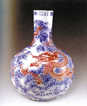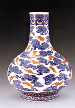 ◆乾隆时代的器物有富贵之气,以粉彩为主流,集开光(即在器物上留出空白处绘画)、色釉、镂空、堆塑、绘画、描金等方法于一件器物上。而青花釉里红盛行,青花器色泽浓艳,釉里红淡雅。官窑器大部分有款,一般以青花写款。