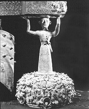 时代为战国早期的曾侯乙编钟有钟架一副,由铜人立柱和木质横梁等构件组成,为曲尺形立架,共分三层:上层由四根铜柱分别支撑,置于中层横梁之上;中层有三个铜人和一个铜圆柱分别置于下层横梁之上,位置与下层立柱及铜圆柱相对应,其上亦顶托着呈曲尺相交的长、短两根木质横梁,横梁两端亦各套青铜套;下层由三个带座佩剑铜人顶托着曲尺相交的长、短木质横梁两根,长梁中部另加一铜圆柱支撑,铜人柱下各有带四个铜环的铜圆垫圈一个。钟架出土时,绝大多数钟仍然悬挂其上,十分稳固,经X光探测得知,所有铜人均中空。