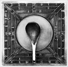 司南在战国时已出现。据记载,司南由天然磁石琢磨而成,形似勺,底圆滑,磁南极一头呈长柄状。王充在《论衡》中描述:“司南之杓,投之于地,其柢指南。”此处所谓“地”,是古代占卜用的“地盘”,形方,四周刻有八干(甲、乙、丙、丁、庚、辛、壬、癸)、十二支(子、丑、寅、卯、辰、巳、午、未、申、酉、戌、亥)、四维(乾、坤、艮、巽)二十四向(又称“二十四山”)。地盘中心有一极光滑的圆面,置司南于其上,使之自由旋转,静止时长柄所指即是南方。这种配有地盘的司南,便是罗盘的前身。